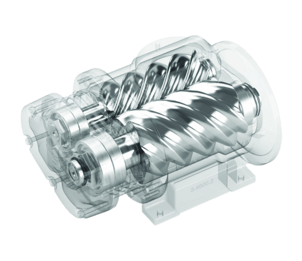 Zwei miteinander verschraubte Rotoren drehen sich in einem Gehäuse, wodurch die Luft zwischen den Rotor und Gehäuse verdichtet wird. Der Vorteil dieses Designs liegt in der geraden, nahezu pulsationsfreien Druckluftabgabe, die zu einer höheren Energieeffizienz und einer längeren Lebensdauer der Kompressoren führt.